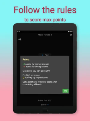 Challenge your mind with 4th grade level Math and see where you stand. There are 100 questions/levels sprinkled with some interesting Math puzzles in between. Create and share a certificate of your final score. Challenge your friends and family to see who can score the most.