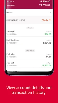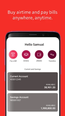 Here’s what you can expect: • A clear overview of all your accounts. • Filtered transaction history according to your needs. • Seamless transfers between your accounts. • Buy airtime and pay bills from where you are. • Send money to a mobile wallet account. • Control over your account activity.