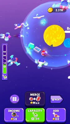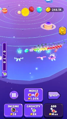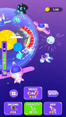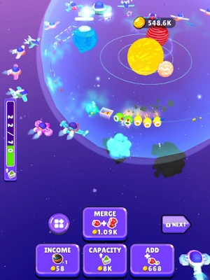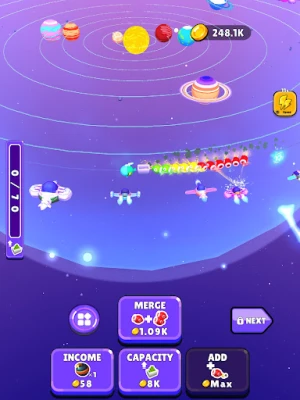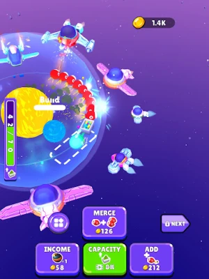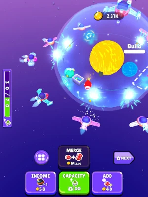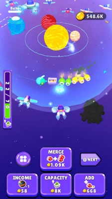 Destroy alien spacecraft and obtain materials. Building planets using materials. Build many planets to form a galaxy. Raise the level of fighter jets to enhance combat effectiveness. Increasing the capacity of transport ships can pick up more materials.