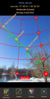 * Continuous tracking of your position and update of the contact times. Useful if you observe the eclipse on board a ship.