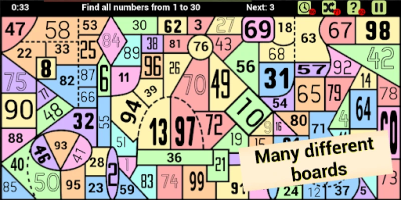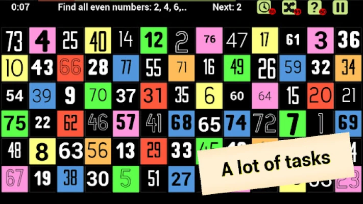 Easy to play: all you need to do is find the required numbers on the board and tap on them. Test your mindfulness and try to get three stars on all levels.