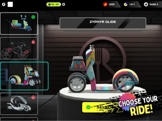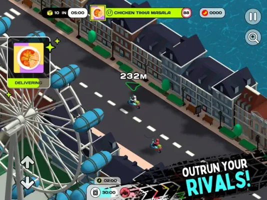 You are set on a mission to save the planet, zooming through the streets of various cities, racing against the clock and other riders to deliver food orders at assigned locations.