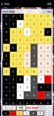 <遊び方>①ぬりえを選択してぬりえ画面を表示します。 ※1つクリアすると次のぬりえで遊べます。②色を選択してキャンバスの該当数字をタップします。③完成したらチェックボタンを押します。④全部一致していたら完成です。 3回チェックNGでゲームオーバーです。