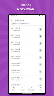 - Realistic Mock Exams: Practice with 50 tests that mirror official Goethe and Telc exams for A1, A2, B1, B2, and C1 levels.