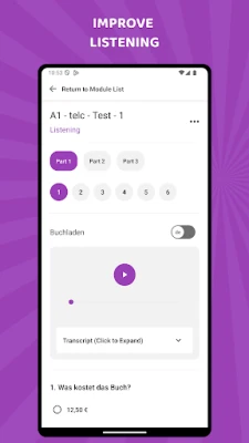 - Listening Exercises: Improve your skills with audio tests and transcription support.