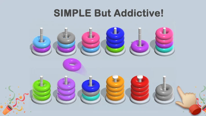 Game Targe: Sort the hoops,Ensure that the color of the hoop on stack pile is the same!