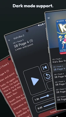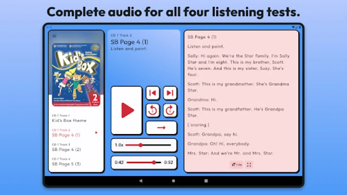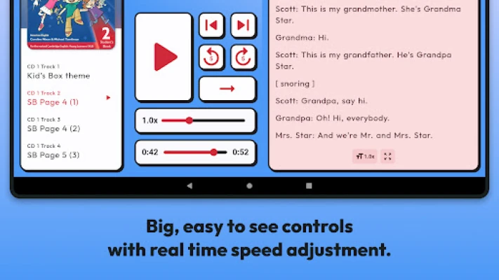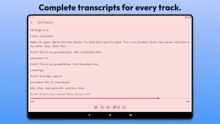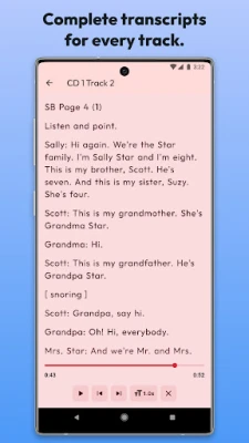 💬 Transcripts are available for every track! On tablets the transcript screen and text size can be enlarged so teachers can display them on smart boards. A mini control panel means you don't have to leave the transcript to control playback.