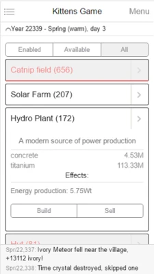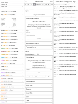 Kittens Game is a village simulation text game. You manage a village of kittens as they acquire resources and unlock new technologies.