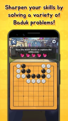 Train your brain with Baduk puzzles for beginners to intermediates in the Training Grounds, test your current skills in the Tower of Trials, and enjoy customizing your avatar and board with a variety of skins!