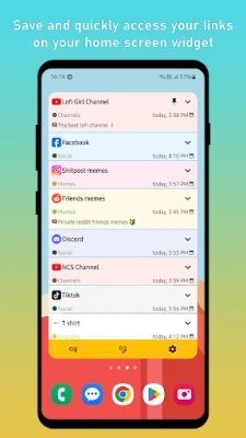 With this app you can save unlimited links to your home screen widget. You can reorder links, add categories, change colors, save custom icons (or directly download icon from URL link), add comments, copy, share, pin your favorite links, etc.