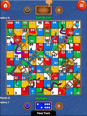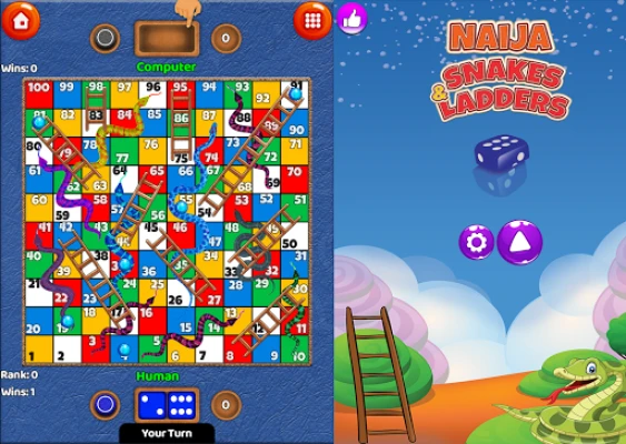 It is played by one person and computer. It is equipped with two dice but can also be played with one die. It is made up of 100 tracks starting from 1 to 100. The first player to reach the last track is declared winner. The aim of the game is to move to the last track (100) before your opponent using the outcome of the dice or die. Naija Snakes and Ladders is very easy to play. Tap the dice at the middle of the board to roll the dice and tap on the round button below to move your piece. If your piece stops at the head of a Snake, it must be returned to the tail of the snake but if your piece stops at the bottom of a ladder it must move to the top of the ladder. The secret is to avoid the Snake and embrace the Ladder.