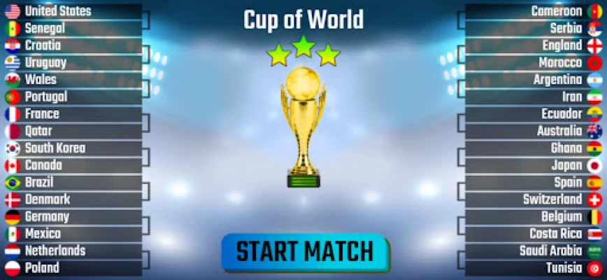 You select your favorite country, prepare your team hard and try to win match after match as you go through the rounds, reach and win the quarter finals and semi finals to make it through to face the grand final of the championship!