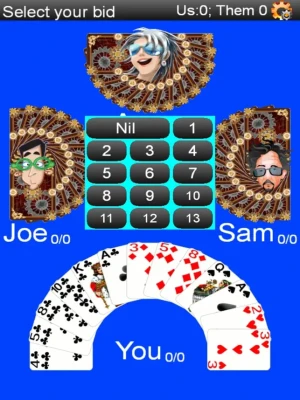 All four players bid a number of tricks. Each team adds together the bids - number of tricks that team must try to win in order to get a positive score. Everyone must bid a number. Players are not allowed to pass and bids once made cannot be altered. A bid of 0 tricks is known as Nil. This is a declaration that that the player who bid Nil will not win any tricks during the play. There is an extra bonus for this if it succeeds and a penalty if it fails. The partnership also has the objective of winning the number of tricks bid by the Nil's partner.