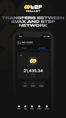 Step Crypto Wallet simplifies digital asset transfers with its instant, anywhere-anytime feature. It has two tabs: 'Internal' for funding transactions into Step Ecosystem and 'External' for withdrawing tokens from Step Network to AVAX C-Chain, compatible with wallets like Metamask.