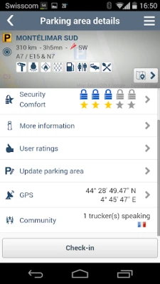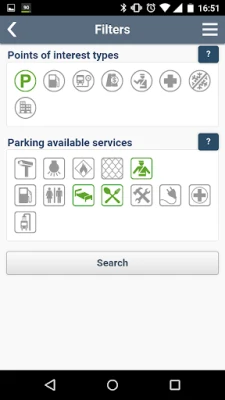 • Comfort levels (fuel station, sanitary facilities, hotel, restaurant/buffet, coffee shop, medical assistance, electric connection, vehicle repair, vehicle wash)