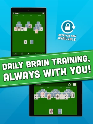 Clear the 3 pyramids of cards by tapping the card that rank 1 above or 1 below the value of the card in the waste pile. Choose wisely to uncover the face down cards and remember: you can only go through the deck once! A real puzzle. A challenge always new that will keep your brain in good shape.
