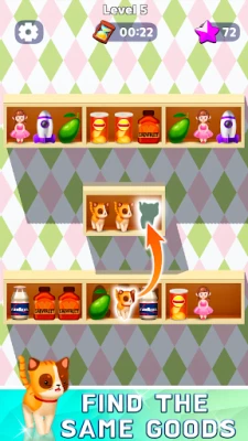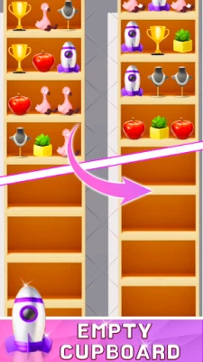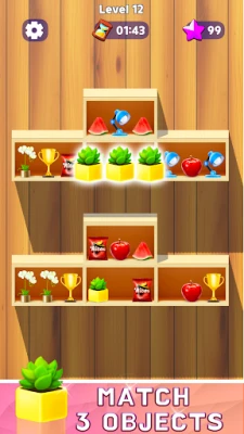 Amidst the captivating mosaic of items, control the sorting effortlessly: triple-match identical 3D items on expansive shelves, fill cabinets, complete pairs, or triple-match them for the ultimate organizational challenge!