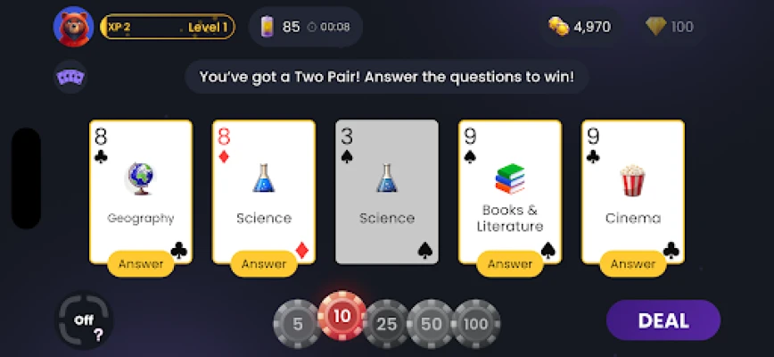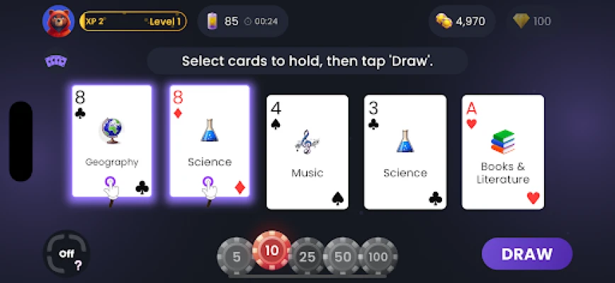 Whether you're a trivia genius or card shark, Trivia Poker offers a fun, brain boosting challenges for all skill levels.