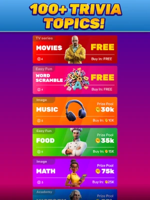 Hundreds of topics – From pop culture and sports to science, history, and brain teasers. Whether you're into movies, music, sports, food, celebrities, or even math, Literature, Spelling, Riddles, Logic, Flags, Capital Cities, Space, Mythology, Human Body, Inventions, Famous Landmarks, Chemistry, Biology, Physics, Nature, Animals, Plants, Weather, Environment, Oceans, Cars, Technology, Computers, AI, Programming, Gaming, Board Games, Video Games, TV Shows, Disney, Netflix, Superheroes, Anime, Harry Potter, Star Wars, Game of Thrones, Marvel, DC, Pokémon, Cartoons, Books, Comics, Famous Quotes, Lyrics, Pop, Rock, Hip Hop, Country, Jazz, Classical, Musical Instruments, NBA, NFL, MLB, NHL, Soccer, Tennis, Olympics, WWE, Extreme Sports, Food, Drinks, Cooking, Recipes, Health, Fitness, Medicine, Fashion, Beauty, Travel, Holidays, Traditions, Languages, Slang, Fun Facts, and much more!