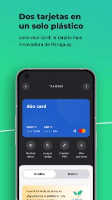 Solo registrándote, contás con una tarjeta virtual de débito internacional para que puedas pagar desde tus suscripciones hasta tus compras por internet. Te ofrecemos los mejores beneficios para que puedas obtener reintegros con todos tus pagos: con QR o con tarjeta. Además, podés calificar para préstamos pre-aprobados que desembolsamos en el acto o para nuestra dúo card: dos tarjetas en un mismo plástico. Así como leíste: débito y crédito en un solo lugar. En ueno bank, todos tus datos y transacciones están protegidas. Tu dinero lo cuidamos siempre: contamos con el resguardo del Fondo de Garantía administrado por el Banco Central del Paraguay. Unite a ueno bank, el banco digital de todos los paraguayos.