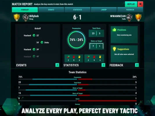 Engage in Quick Match mode to test different strategies, formations and tactics. Train your players daily to ensure peak performance, crushing your rivals' dreams of victory.