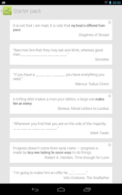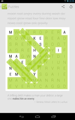 • Quotes puzzle: Find words and eliminate them from the letter square. Letters that remain in the square will spell out the remaining words of a famous quotation.