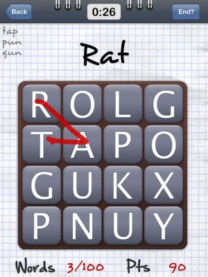 Form valid words by tracing letters on the board with your finger. Words can only be formed by connecting neighbouring letters, and the minimum word length is 3 letters. When you think you have found a word, release your finger from the board, and if valid, you score a point in the game.